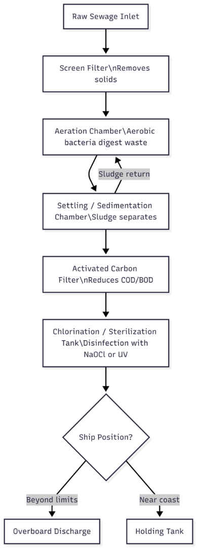 The treatment process converts raw sewage into an effluent that is safe for discharge into the sea, meeting the strict standards set by MARPOL Annex IV under the International Maritime Organization (IMO).