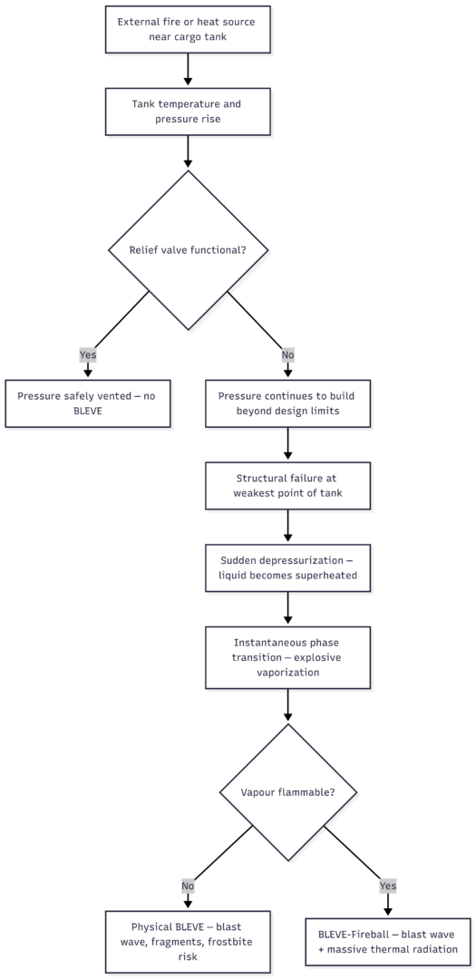 If the vapour is flammable — as is the case with LPG, propane, or butane — ignition produces a massive fireball and blast wave capable of destroying the vessel and surrounding infrastructure.