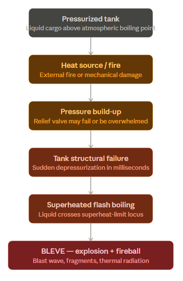 A BLEVE is an explosion triggered by the catastrophic rupture of a pressure vessel that contains a liquid held above its atmospheric boiling point. Because pressure is what keeps the substance liquid, any sudden loss of containment causes an instantaneous drop in boiling point. The liquid, now far above its new boiling point, flashes into vapour almost instantaneously — typically within one millisecond — releasing an enormous amount of energy in the process.