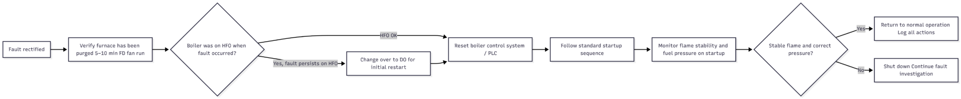 - If the boiler will not restart on HFO, change over to diesel oil — it is easier to ignite and will confirm whether the combustion system is functional while the HFO system is further investigated
