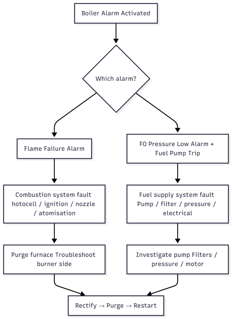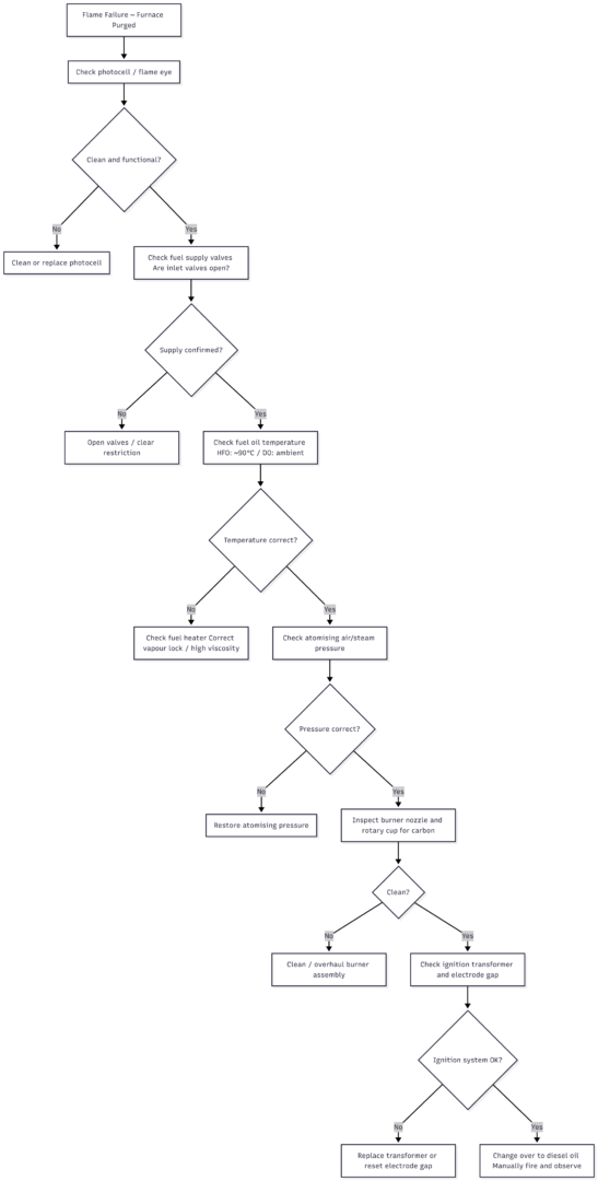 | Flame failure — supply side | Low FO pressure, air in line, blocked filter | Fuel pressure gauge, filter condition, bleed points |